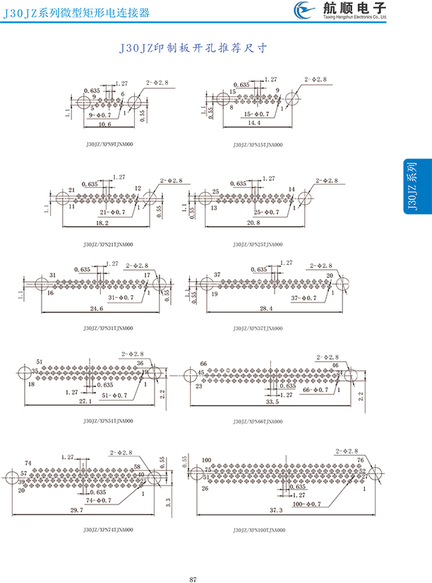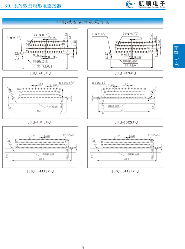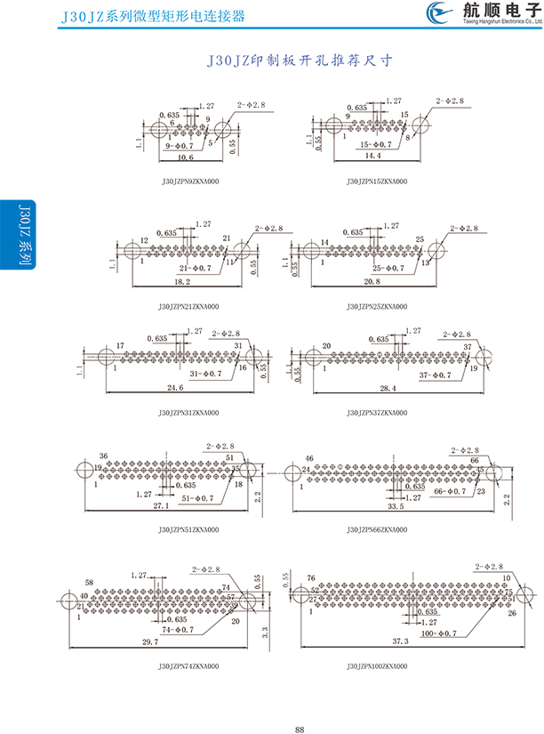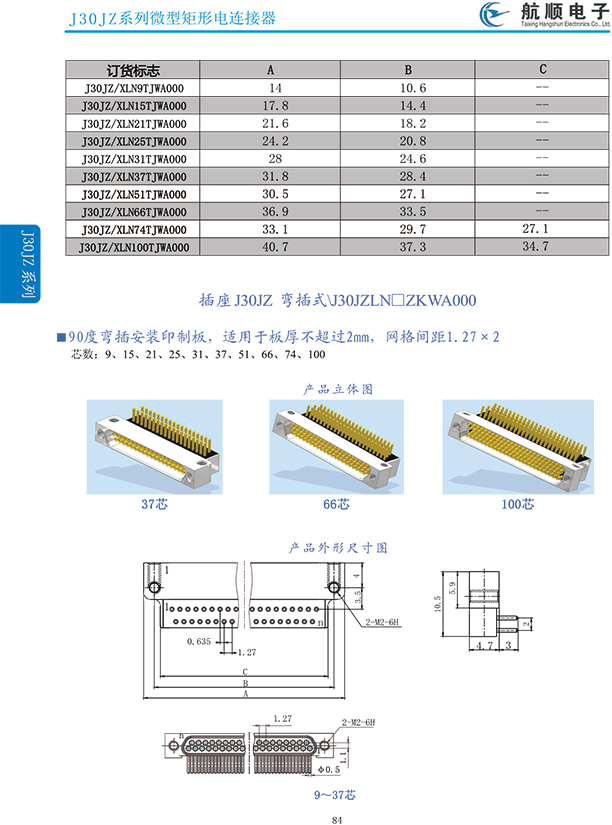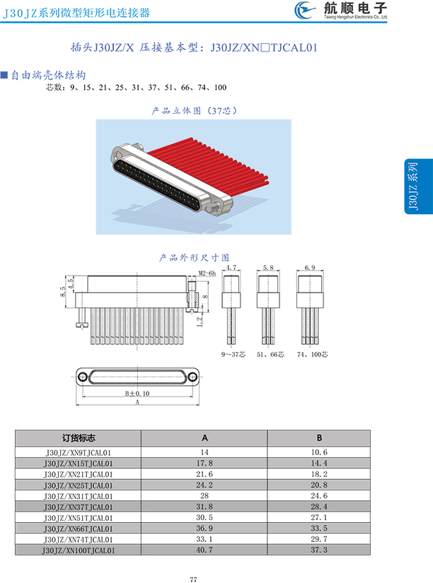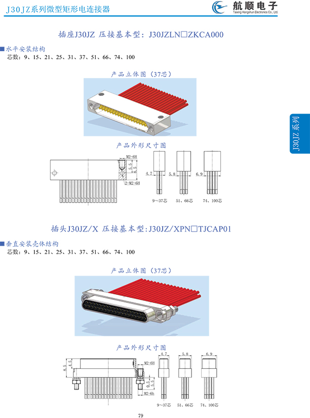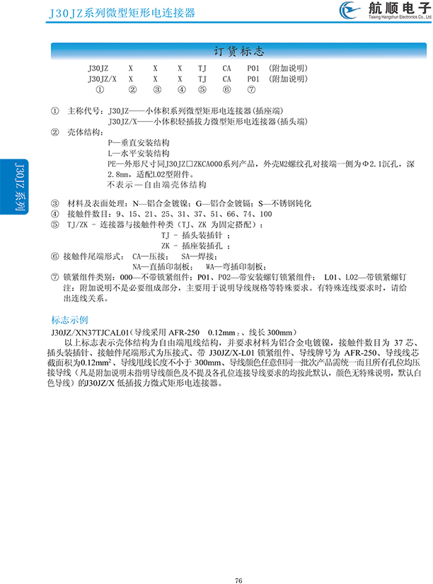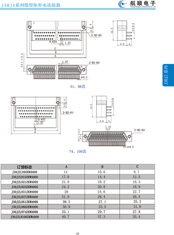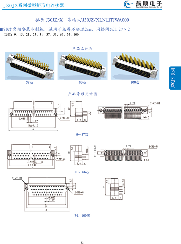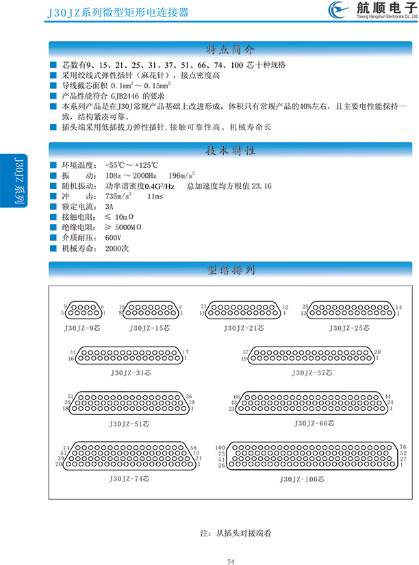 符合GJB2446《外殼定位超小型矩形電連接器總規(guī)范》(相當(dāng)于美軍標(biāo)MIL-C-83513),可與美國(guó)MDM系列產(chǎn)品和國(guó)內(nèi)同類產(chǎn)品互換,在J30系列產(chǎn)品的基礎(chǔ)上增 加了鋁合金外殼與各種鋁合金尾夾;采用絞線式插針 (俗稱麻花針),單個(gè)接觸件接觸點(diǎn)達(dá)七個(gè),提高了產(chǎn)品的接觸可靠性;采用1.27mm網(wǎng)格,接觸件密度大、體積小、重量輕;現(xiàn)有9、15、21、25、31、37、51、66、74、100芯共十種型譜可供選用;適用導(dǎo)線線芯 截面積為0.07~0.15mm2,尾端可以根據(jù)用戶要求進(jìn)行 布線;本產(chǎn)品的鎖緊組件按與產(chǎn)品組裝在一起提供,如不需鎖緊組件請(qǐng)?jiān)诤贤凶⒚鳎槐鞠盗挟a(chǎn)品滿足GJB2446《外殼定位超小型矩形電連接器總規(guī)范》的 要求;本系列產(chǎn)品的執(zhí)行標(biāo)準(zhǔn)如下:Q/ZHDZ GC-18《J30J系列微矩形電連接器詳細(xì)規(guī)范》。